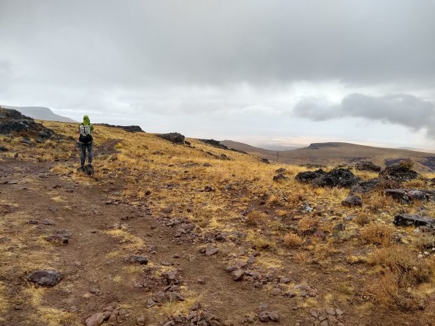 The early morning hours of today we walked up and out of Louse Canyon in fog and rain across a sagebrush rise and fields of volcanic cobble. We futzed with really annoying rusty barbed wire fences. We watched pronghorn in the mist. We ducked behind sagebrush to extract calories from our packs. Otherwise, we stayed on the move.