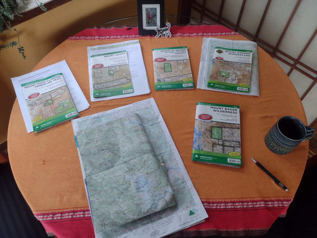 Circumnavigating Hood, Pahto (Adams), Loowit (St. Helens), Tahoma (Rainier), Dakobed (Glacier), and Koma Kulshan (Baker) will total about 400 miles (640 km) of walking, some 130,000 feet (3900 m) of gain, over 25 days. Most of these volcanoes have trails around them to traverse moraines, roam lava fields, and cross the headwaters of streams. There are a few shoulders of Adams and Baker without trails where we’ll be traveling on glaciers, rocky slopes, and forests where “the route goes”. The first three loops in NW Oregon and SW Washington are each 30-40 miles long and will take about 3 days each. The second set of three loops in northern Washington range from 75-110 miles and will take about 6 days each. In between mountains, we’ll be traveling via our trusty car to reach the next trailhead. (Apologies to the uber cool kids that we aren’t hiking or biking between loops, that just woulda upped the anti too much. Hopefully, I’ll get back on a bike after this endeavor. And yes, I’m still working through a sense of never being enough. Maybe this endeavor will help me remember that I am.)